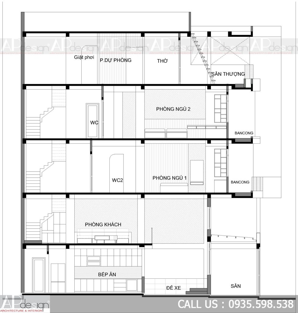 Mặt cắt dọc thể hiện rõ cấu trúc phân tầng thông minh của ngôi nhà. Tầng trệt gồm sân và bếp ăn cao ráo, phía trên là tầng lửng dành cho phòng khách. Lầu 1 và lầu 2 bố trí các phòng ngủ rộng rãi kèm ban công vạt góc đón sáng. Tầng thượng kết thúc bằng phòng thờ, phòng dự phòng và khu giặt phơi tiện lợi.