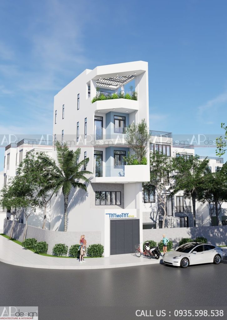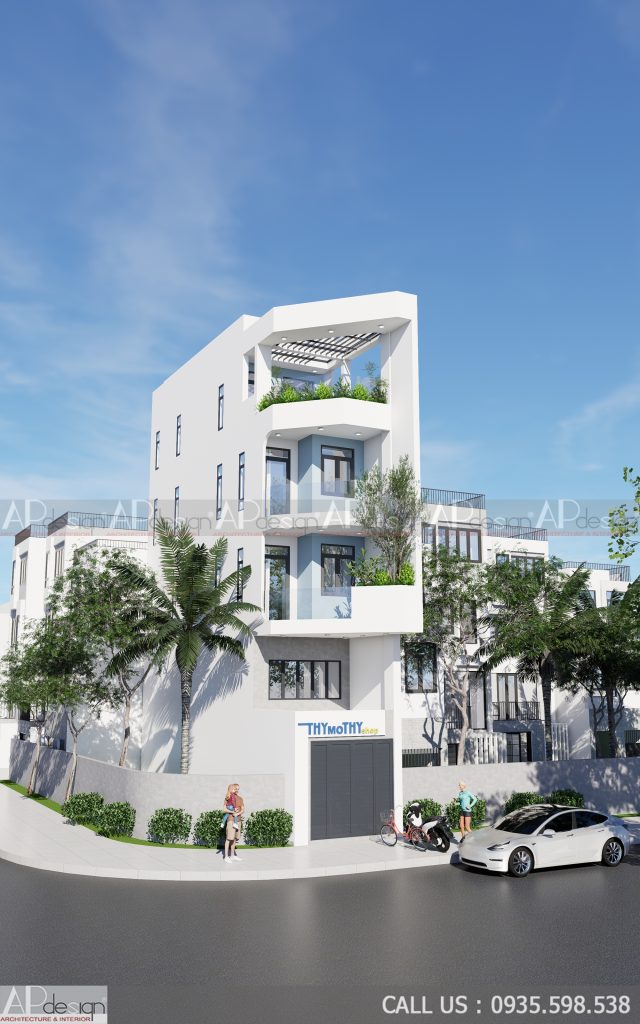Mặt tiền ngôi nhà vạt góc 4 tầng gây ấn tượng mạnh với phong cách kiến trúc hiện đại, sang trọng. Khối nhà sử dụng tông màu trắng chủ đạo, kết hợp hài hòa với các mảng tường sơn hiệu ứng màu xanh lam tinh tế tại khu vực ban công và xám ở tầng lửng. Thiết kế vạt góc độc đáo tạo sự thông thoáng, tận dụng tối đa ánh sáng tự nhiên cho không gian bên trong. Tầng trệt được bố trí garage xe với cửa cuốn tiện lợi, phía trên là các tầng lầu với ban công kính cường lực và hệ thống cây xanh trang trí, mang đến vẻ đẹp xanh mát và tràn đầy sức sống.