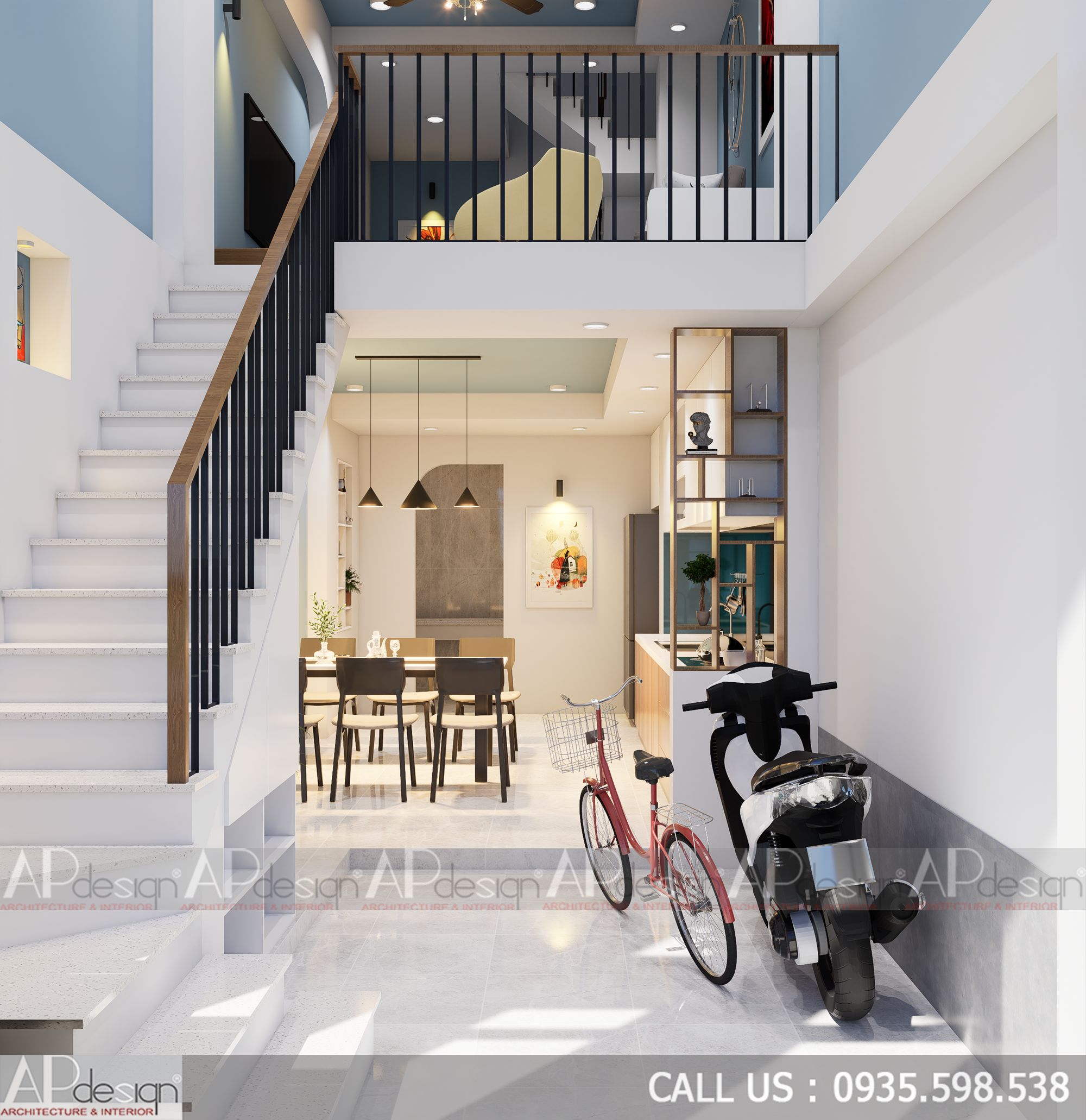 Thiết kế nôi thất nhà có gác lửng để thể hiện rỏ công năng thông suốt và trang trí nội thất đồng bộ của tầng trệt lửng.