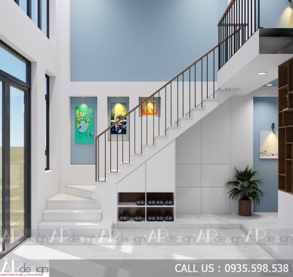 Cầu thang lên lững tiếp cận trực tiếp phòng khách. Bên khoảng thông tầng để xe tiếp đến là bếp và khu wc phía sau. Khong gian thông suốt thoáng để tiếp cận mọi tiện ích công năng sử dụng.