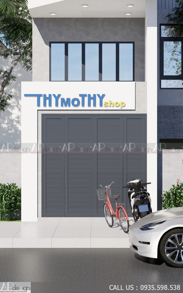 Mặt tiền shop tại tầng trệt gây ấn tượng với hệ cửa bốn cánh màu xám đen hiện đại và bảng hiệu nổi bật. Kết hợp cùng mảng tường sơn hiệu ứng xám, tạo nên diện mạo trẻ trung, chuyên nghiệp cho không gian kinh doanh tại vị trí vạt góc.